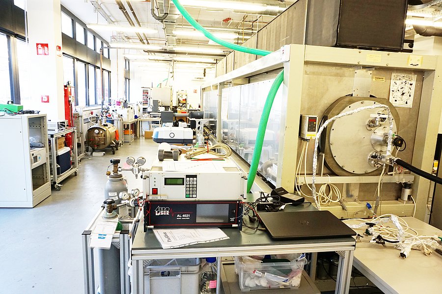 Die Simulationskammer wird nach jedem Experiment durch Evakuieren für mindestens 30 min gereiningt. Wenn die Kammer nicht im Einsatz ist, wird durch eine Trubopumpe kontinuierlich evakuiert. Eine manuelle Reinigung des Quartzzylinders sowie der entfernbaren Komponenten (Spiegel des Whitesystems, Ventilatoren, Einlasssysteme usw.) erfolgt einmal im Jahr oder nach Bedarf.